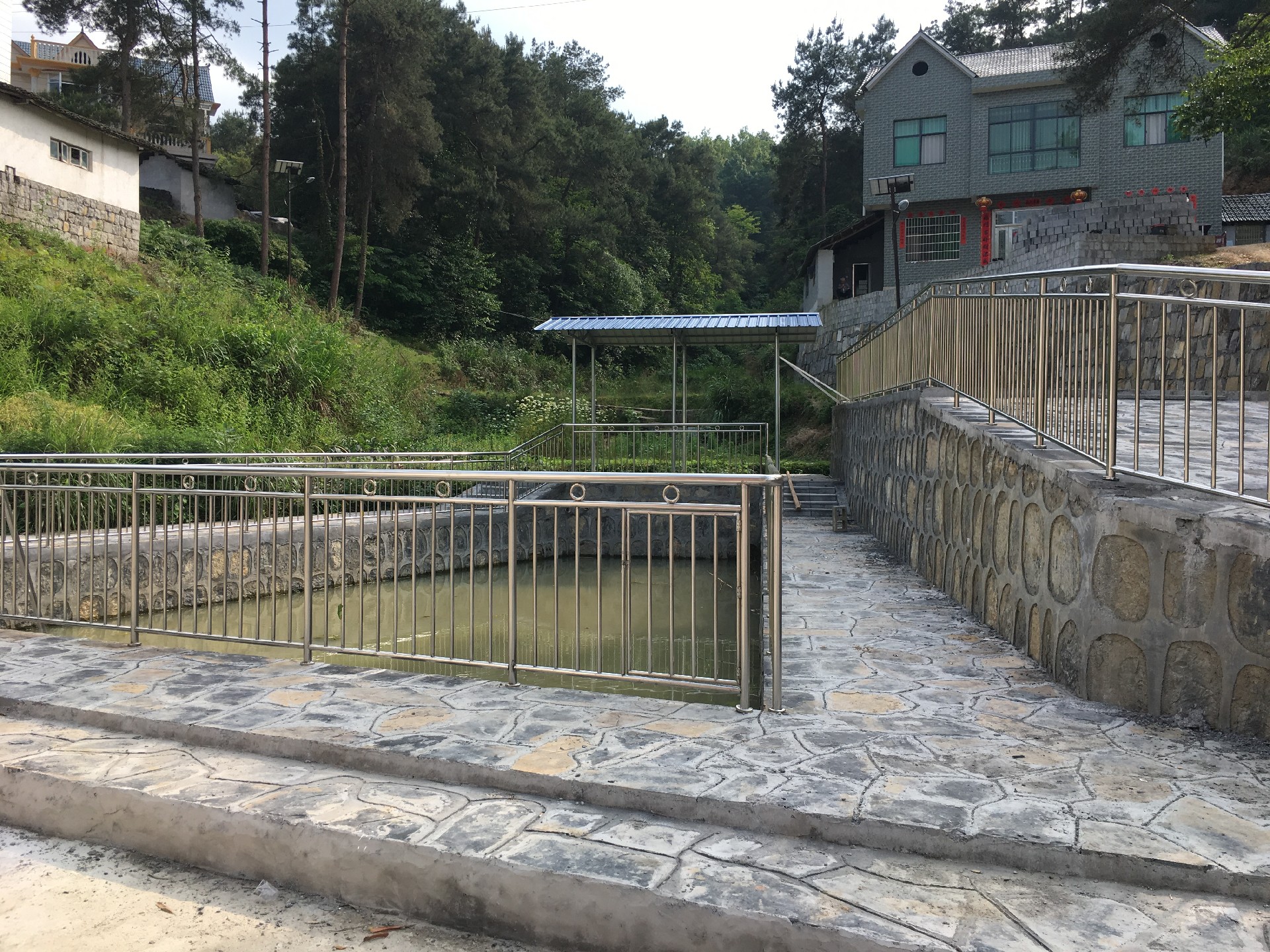 在氧化塘改造方面,我司对项目区原有的纳污坑塘进行清淤,增设生态浮岛,其上加种多年生水生草本植物,沿岸护坡,水塘旁道路硬化,设置护栏等,并适当投放水生生物(螺、蚌和养鱼等),构建人工生态系统。